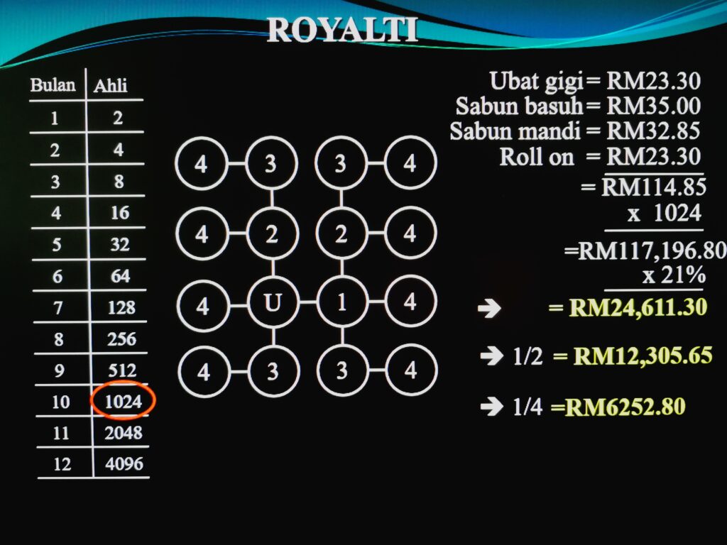 Seperti yang ditunjukkan ilustrasi dibawah, dalam masa sepuluh bulan anda mampu mengumpul lebih dari 1000 orang ProSumer dalam organisasi anda dengan hanya berkongsi dan ajak mereka menyertai anda, hanya dengan 1 orang sebulan sahaja, anda akan diberi royalti yang sangat lumayan, dan jumlah itu akan bertambah secara exponential…….kalau anda buat lebih maka lebih banyak lah yang akan anda dapat.